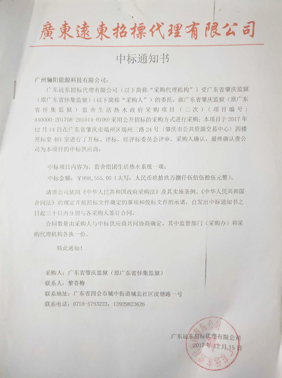 廣東省肇慶監獄監舍生活熱水政府采購項目